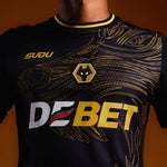 Het Wolverhampton Wanderers 24/25 uitshirt van Sudu is stijlvol zwart met een opvallend goudkleurig wolfspatroon over de borst. De subtiele geometrische print in de stof geeft het shirt extra diepte, terwijl de gouden details langs de ronde hals en mouwen zorgen voor een luxe uitstraling. Dit shirt straalt kracht en karakter uit—perfect voor fans die de energie van de Wolves willen voelen, zowel op het veld als daarbuiten.